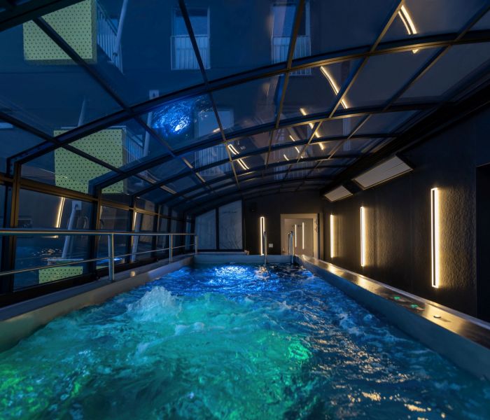 - Dostęp do strefy basenowej, z basenem wyposażonym w dysze do hydromasażu, gejzer wodny oraz strumień wodny (przeciwprąd) pozwalający na pływanie w jednym miejscu