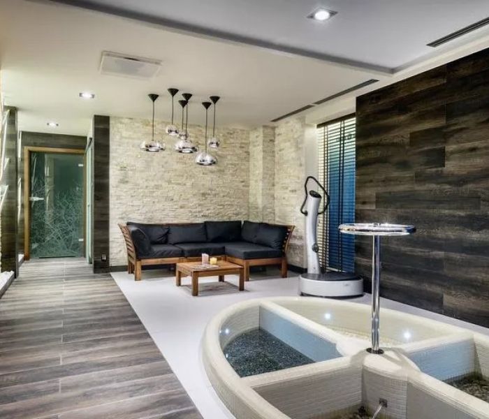 - Dostęp do strefy basenowej (w godz.10-20.30 na zapisy w recepcji), z basenem wyposażonym w dysze do hydromasażu, gejzer wodny oraz strumień wodny (przeciwprąd) pozwalający na pływanie w jednym miejscu